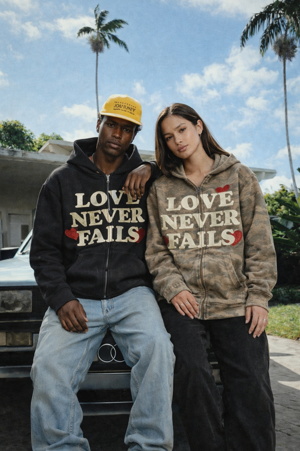 LOVE NEVER FAILS DISTRESSED HEAVYWEIGHT ZIP HOODIE